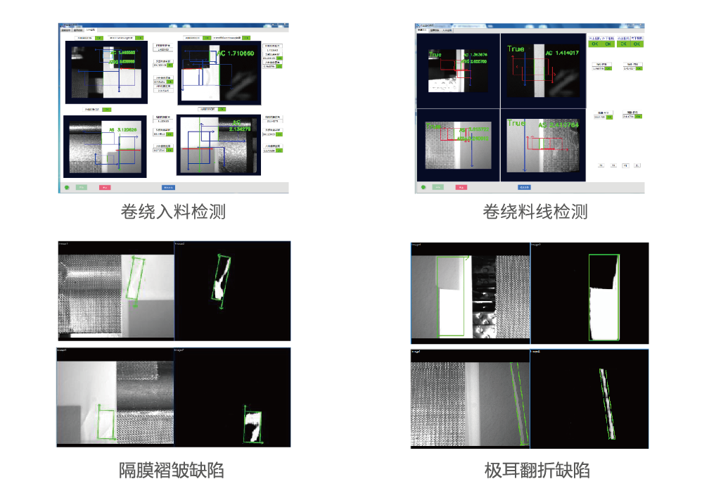 卷繞機是鋰電池成型的主要設備,通過驅動卷針將正負極片和隔膜按照特定的次序卷繞從而形成電芯,在此過程中,需使用視覺進行對齊度糾偏,同時識別相機視野范圍內的涂布、隔膜缺陷,以保證產品質量。為此,我司采用KINOVISION視覺檢測平臺對卷繞過程中的陰陽極距離和整體電芯的尺寸進行檢測,同時創新的采用深度學習的相關算法,實時檢測涂布和隔膜區的各類缺陷,提升產品質量,已經批量應用于鋰電客戶。