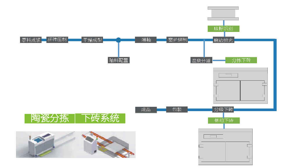 應對勞動力成本攀升和自動化升級的需要,針對陶瓷行業多種瓷磚混燒和不同品質瓷磚分揀的情況,開發了窯尾陶瓷分揀系統。該系統支持至少5類不同尺寸、紋理和顏檢瓷磚同時分揀的需求,作業設置便捷、參數調節簡單,大量的應用于各大知名陶瓷生產企業。